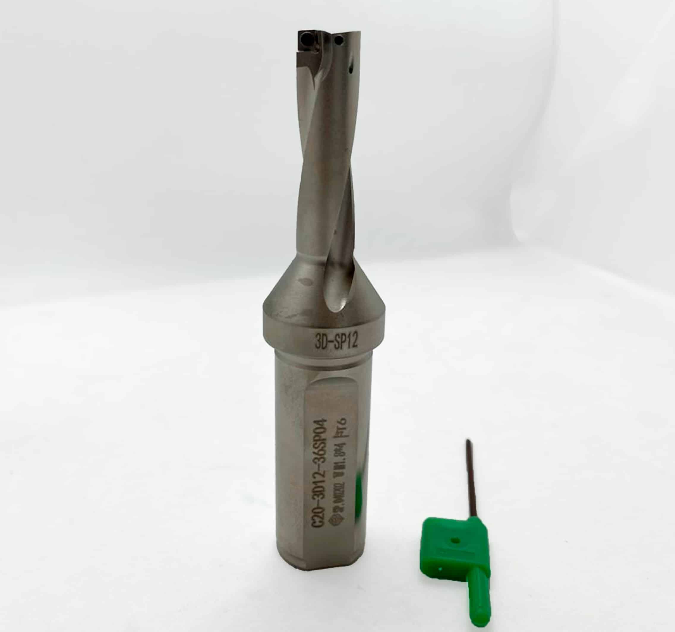 O corpo da broca apresenta ranhuras helicoidais otimizadas para facilitar a saída de cavacos, mesmo em operações profundas.