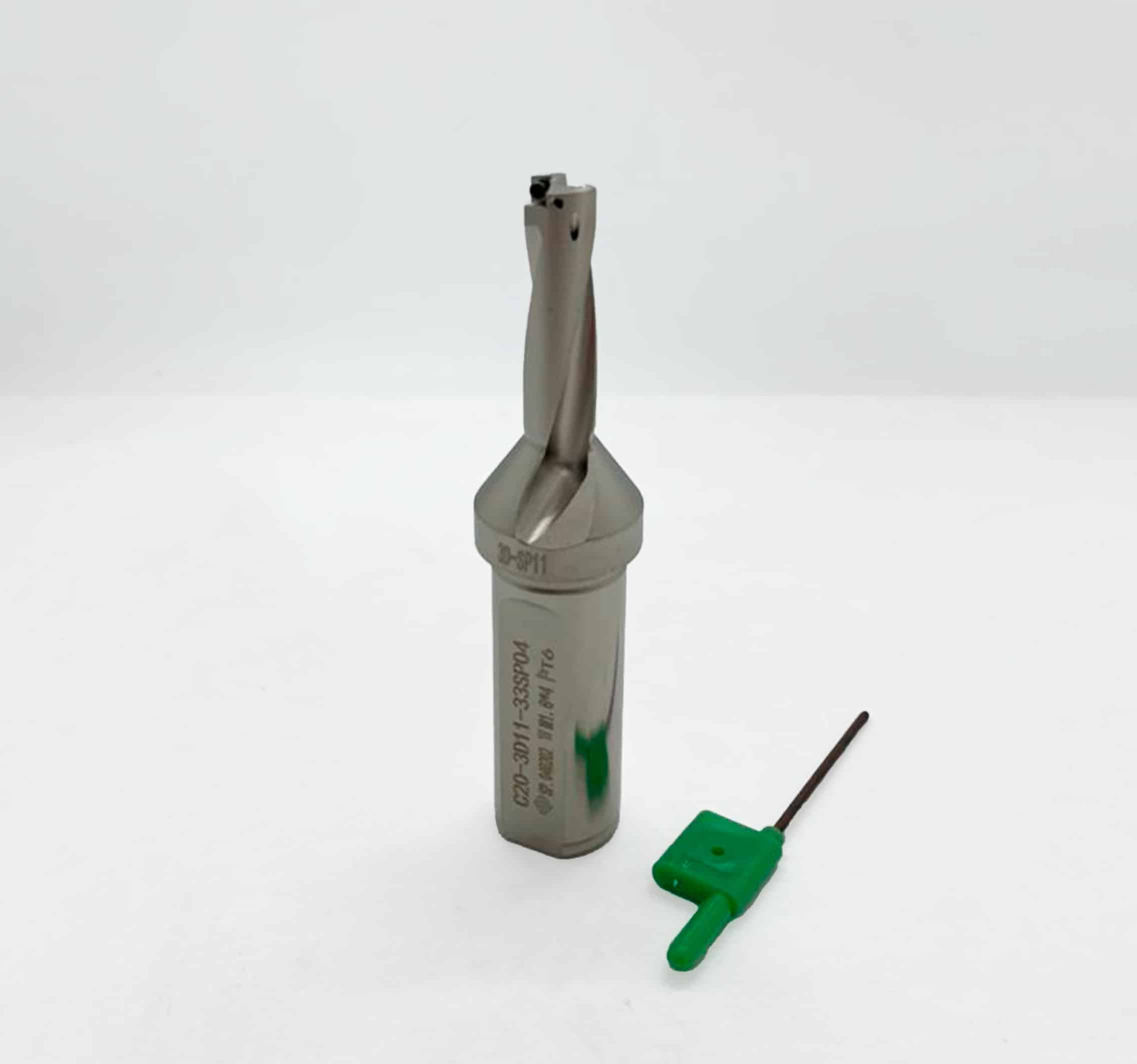 O corpo da broca apresenta ranhuras helicoidais otimizadas para facilitar a saída de cavacos, mesmo em operações profundas.